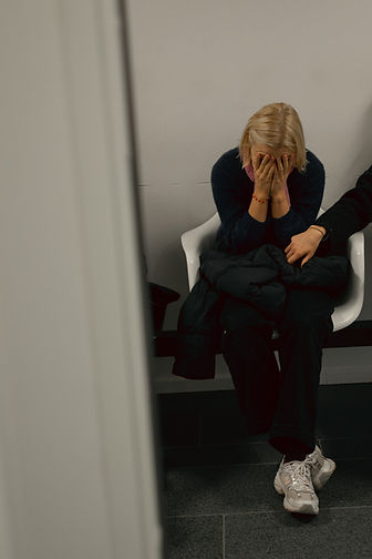 The friend reaches out and gives Frederikke's hand a squeeze. Along with her friend, a staff member from her residential home is also there for support.